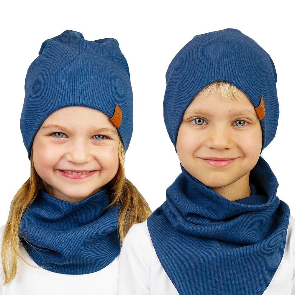Niebieska czapka denim smerfetka dla dzieci o blond włosach i jasnej karnacji. Czapka denim doskonale podkreśli ich urodę i kolor oczu. Niebieska czapka jest łatwa w stylizacji. Pasuje zarówno do ciemnych jak i jasnych kurtek. W sezonie przejściowym świetnie sprawdzi się do jeansowej katany.