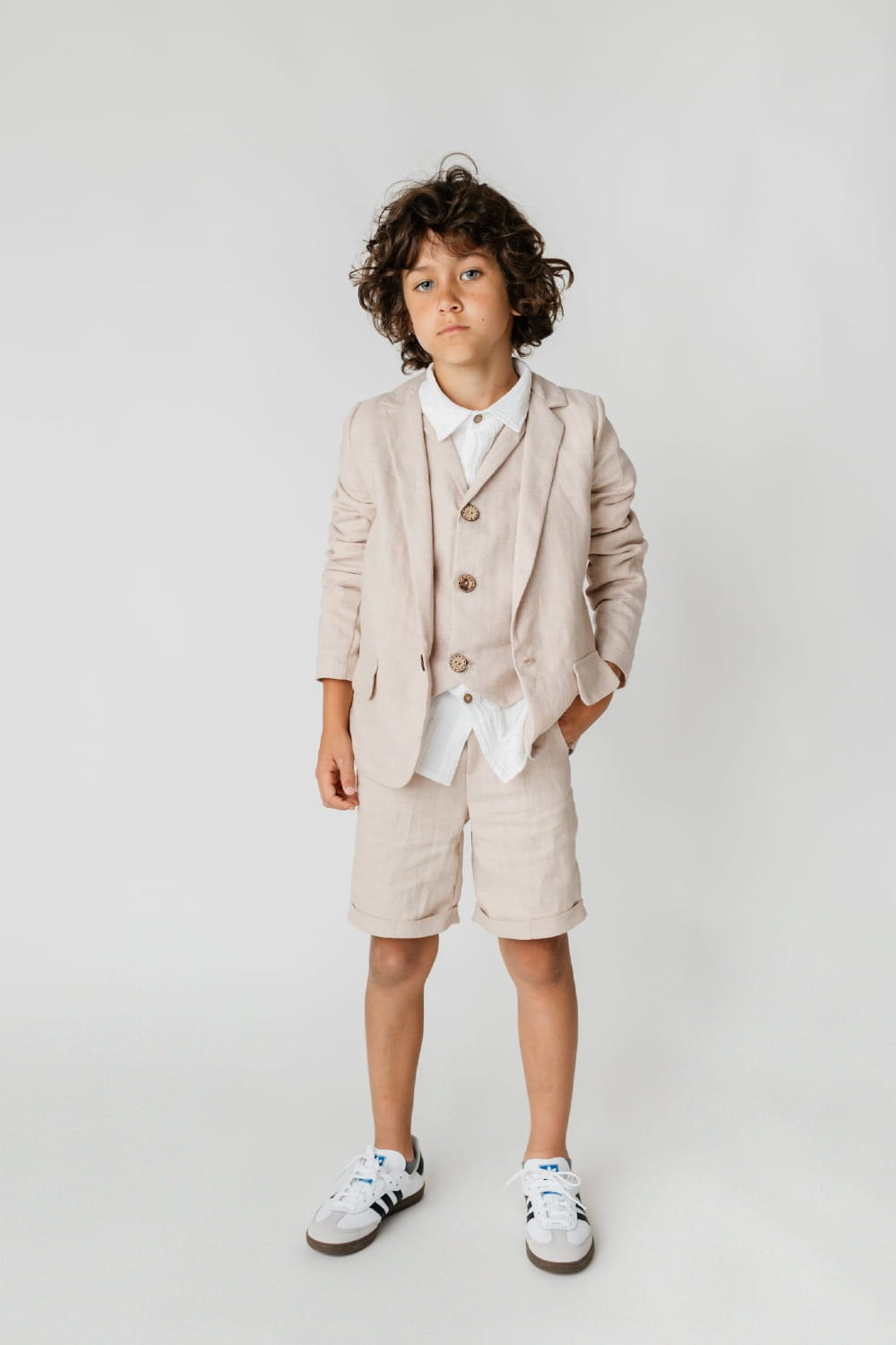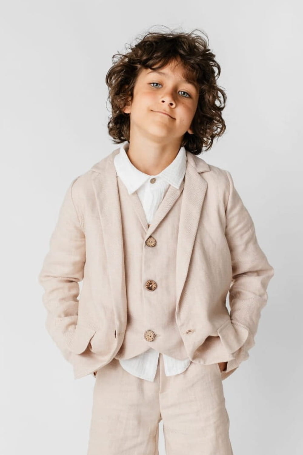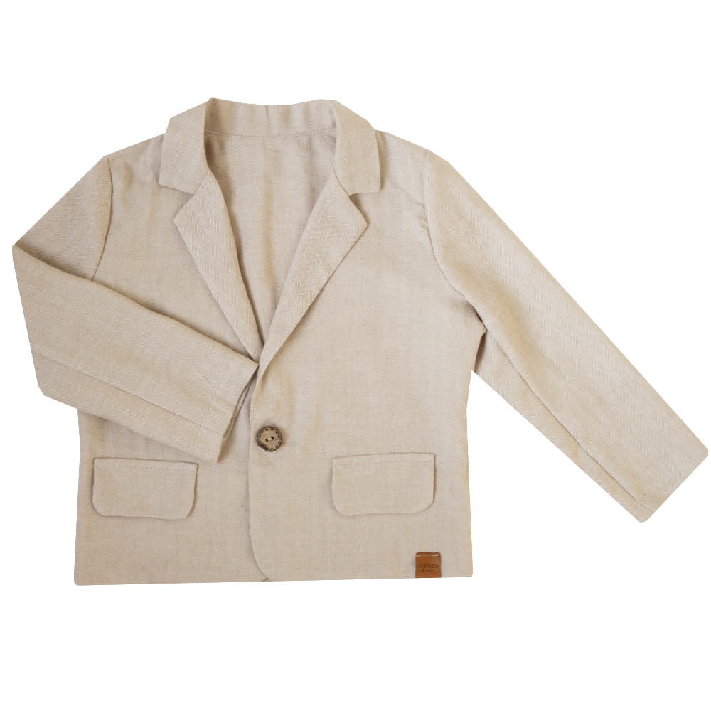 Elegancka marynarka garniturowa beżowa Alan dla chłopca z lnem - komfort i elegancja w ciepłe dni.