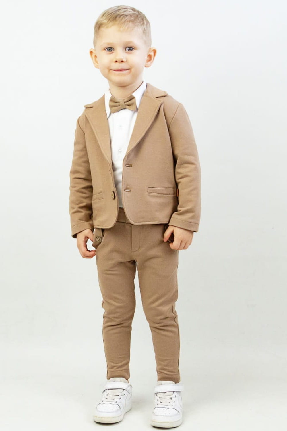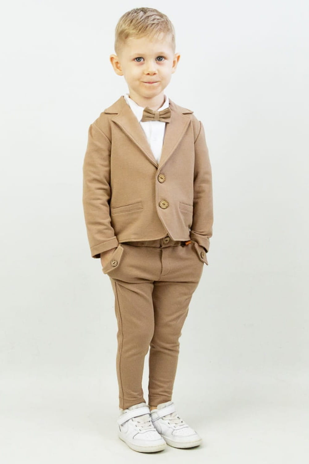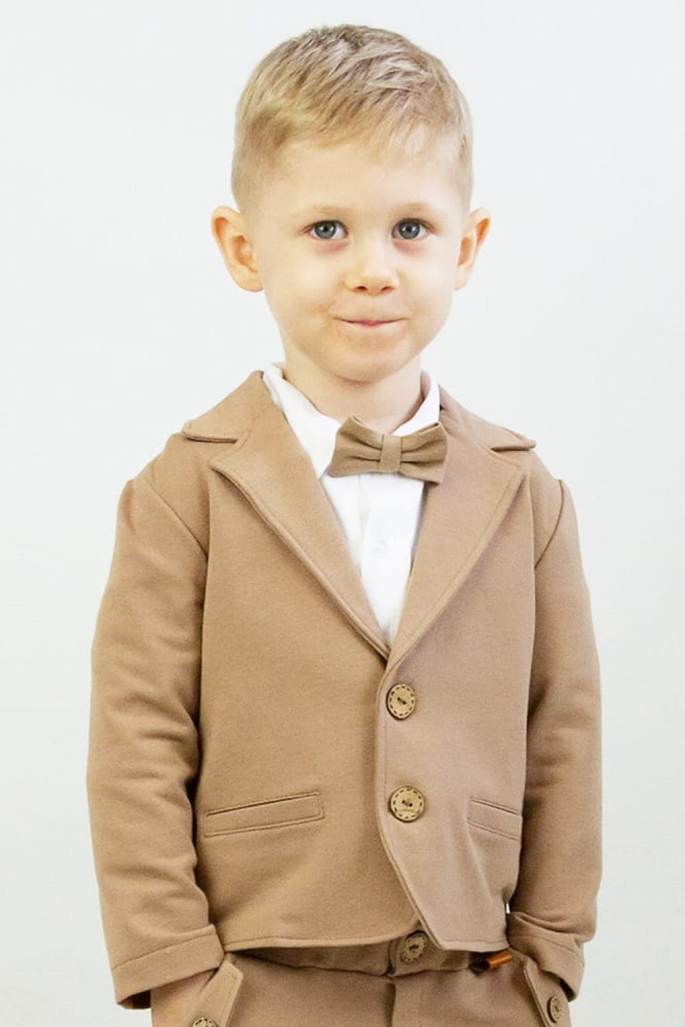 Kolor beżowy coraz śmielej wkrada się do chłopięcej garderoby. Jest to świetny wybór szczególnie wiosną i latem. Dużym atutem marynarki jest możliwość łączenia jej z każdym kolorem spodni. My polecamy zestawienie marynarki w kolorze beżowym z identycznym odcieniem spodni Julian. Taki zestaw uzupełniony białą koszulą i muszką sprawdzi się na wszystkie ważne dla Was okazje.