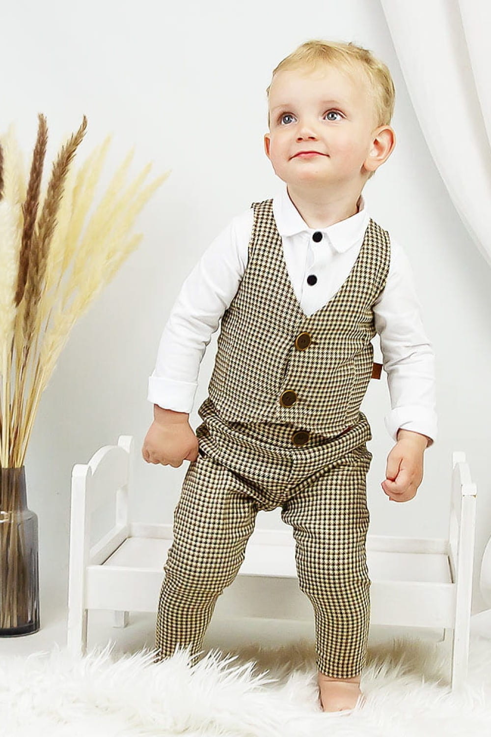 Pepitka to jeden z bardziej eleganckich wzorów, w związku z czym świetnie sprawdzi się na ważnych dla Was uroczystościach. Spodnie w pepitkę połączone z białym body i pasującą kamizelką czy marynarką to doskonały wybór na chrzest, urodziny, wesele. Modne beżowo-brązowe kolory dobrze sprawdzają się zarówno zimą jak i latem.
