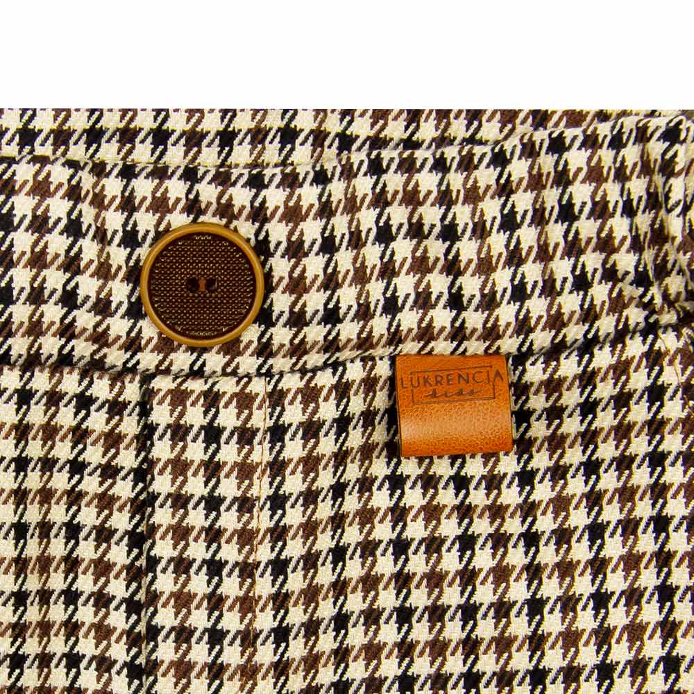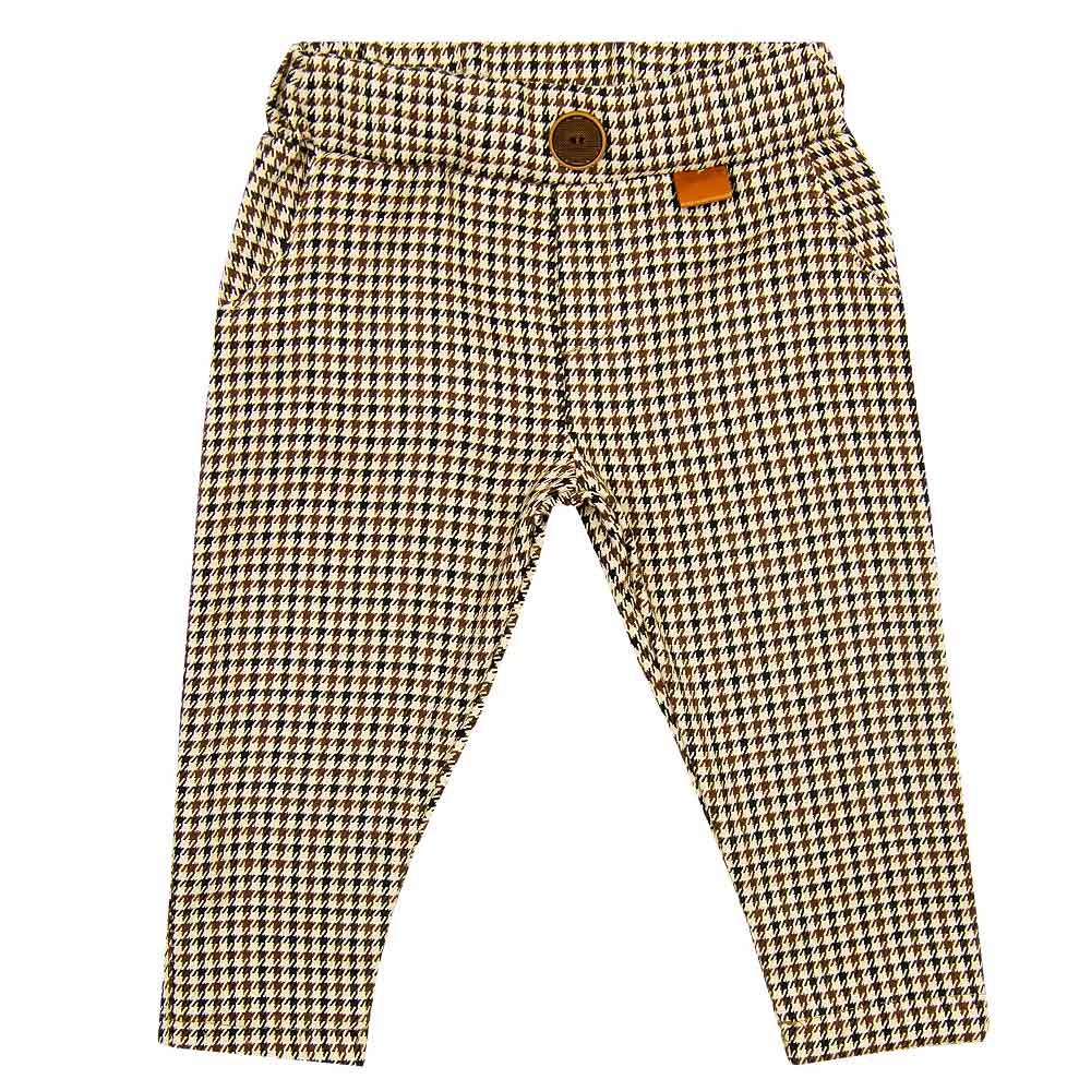 Spodnie Bartek w pepitkę wykonane są z miękkiej i przyjemnej w dotyku tkaniny. Maja prosty i klasyczny fason. W pasie posiadają otwór do regulacji gumki, dzięki czemu z łatwością dopasujesz je figury dziecka. Wzór pepitki w odcieniach brązu i beżu jest ponadczasowy i pasuje do ubrań w stonowanej kolorystyce. Spodnie Bartek mają imitację kieszonek i ozdobione są brązowym guzikiem. Spodnie dostępne są również w dużych rozmiarach (od 92/98 do 128/123), dzięki czemu możesz stworzyć bliźniacze stylizacje dla braci.