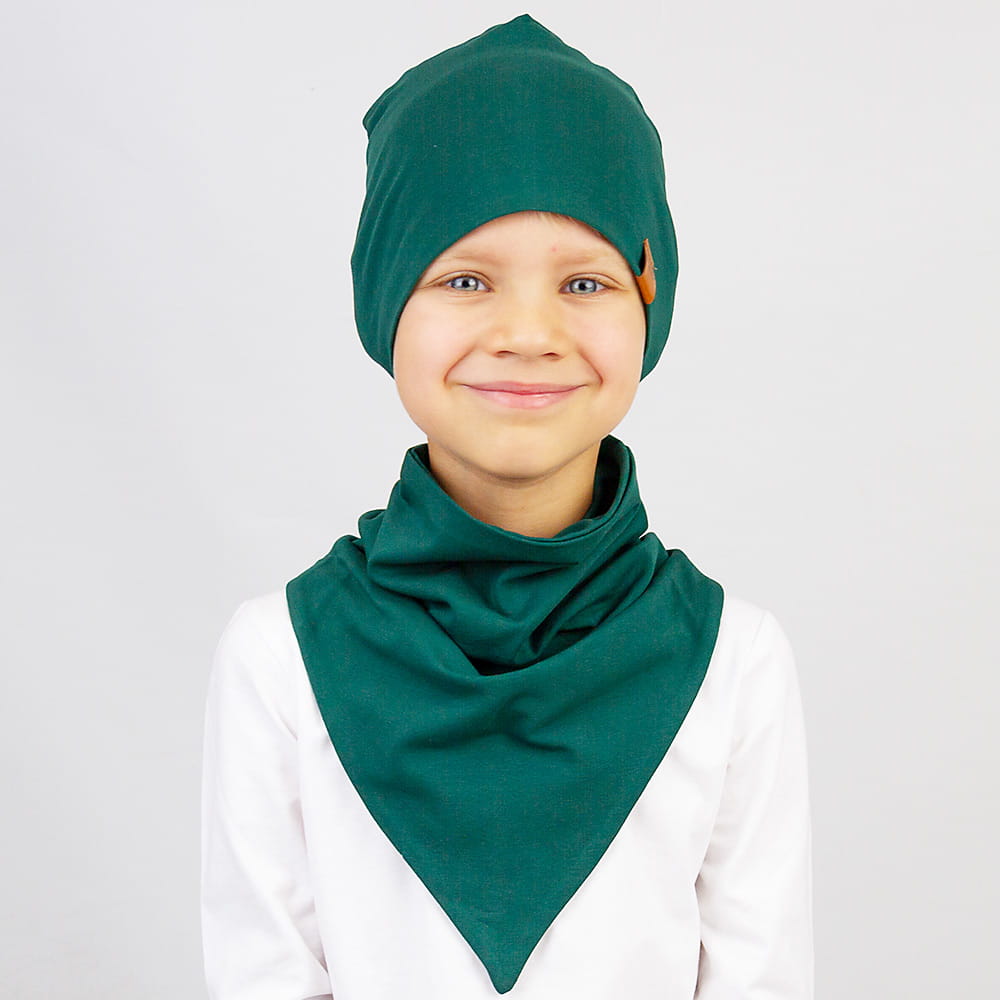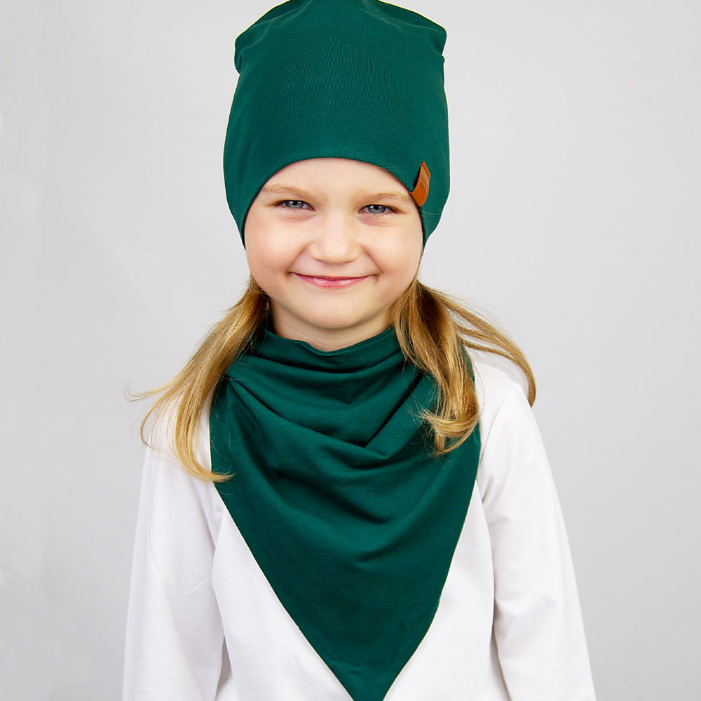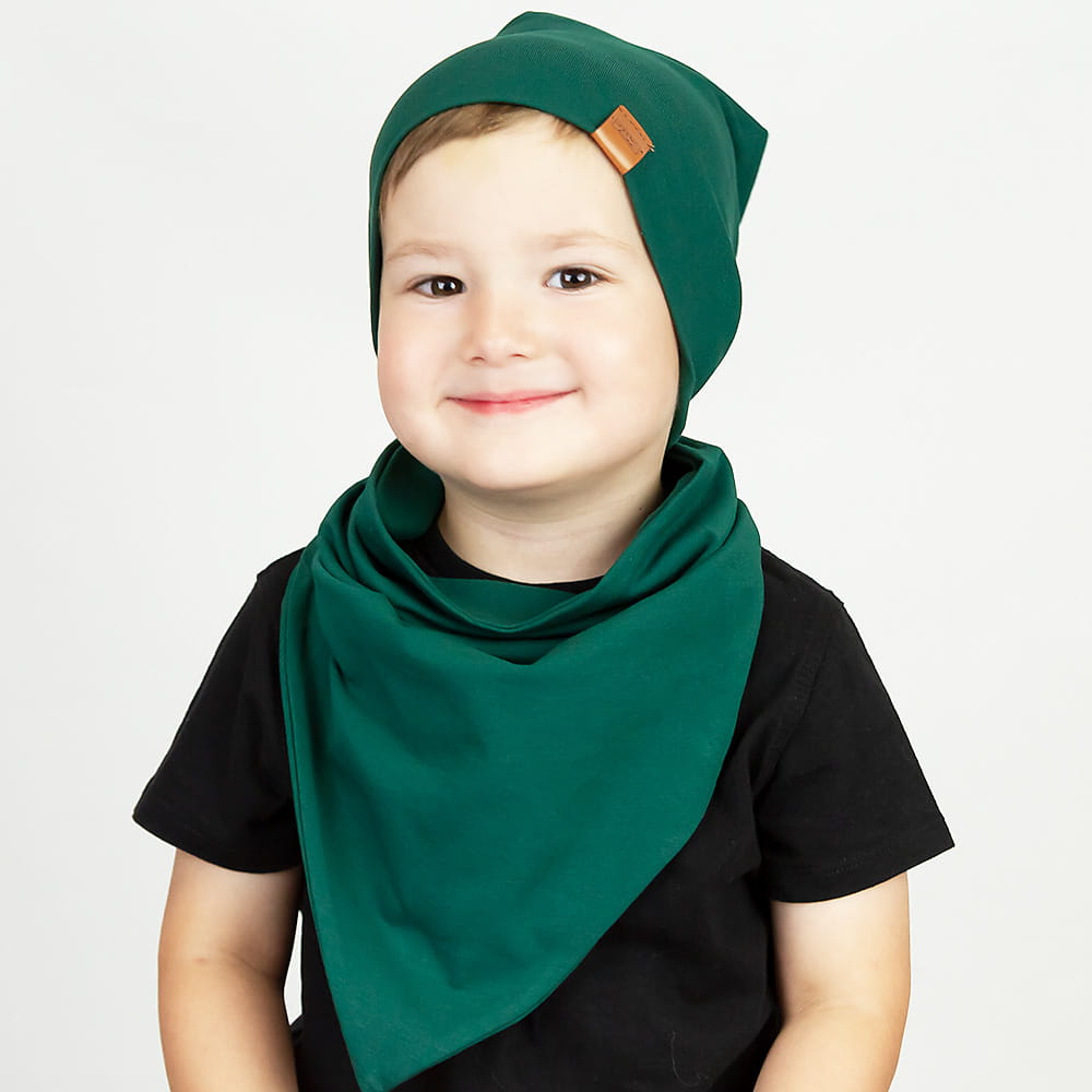 Komino-chusta Andy w kolorze butelkowej zieleni pasuje dzieciom o jasnej i ciemnej karnacji. Kolor zielony doskonale współgra z czarnia, brązem i granatem. Do zestawu możesz dobrać czapkę Alex w identycznym kolorze lub opaskę Gucio.