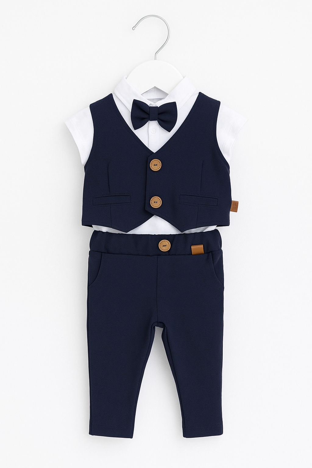 W wersji „mini gentleman” na wesele: Pełen zestaw: body + kamizelka + spodnie + marynarka + mucha.