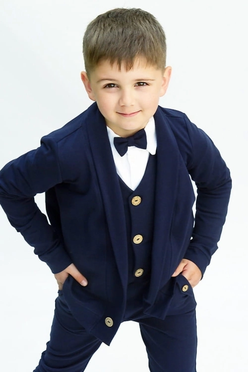 Eleganckie zestawy garniturowe dla chłopców dostępne od ręki. Komplety składają się z 2 elementów garderoby (np. blezer Tymon, spodnie Julian) i tworzą stylową, spójną stylizację na wyjątkowe okazje.